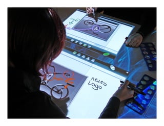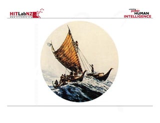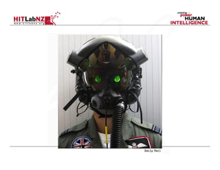 This document discusses augmented reality (AR) interfaces for visual analytics. It provides an overview of AR, including its key characteristics of combining real and virtual images in an interactive and registered 3D space. Examples are given of medical imaging applications and trials of AR interfaces. Design principles for AR user interfaces are outlined, including using physical objects, appropriate interaction metaphors, and principles from tangible interfaces. Case studies demonstrate AR lenses and collaborative AR interfaces. The document concludes with a discussion of future directions such as mobile phone AR, collaborative AR, and ubiquitous VR (UbiVR).