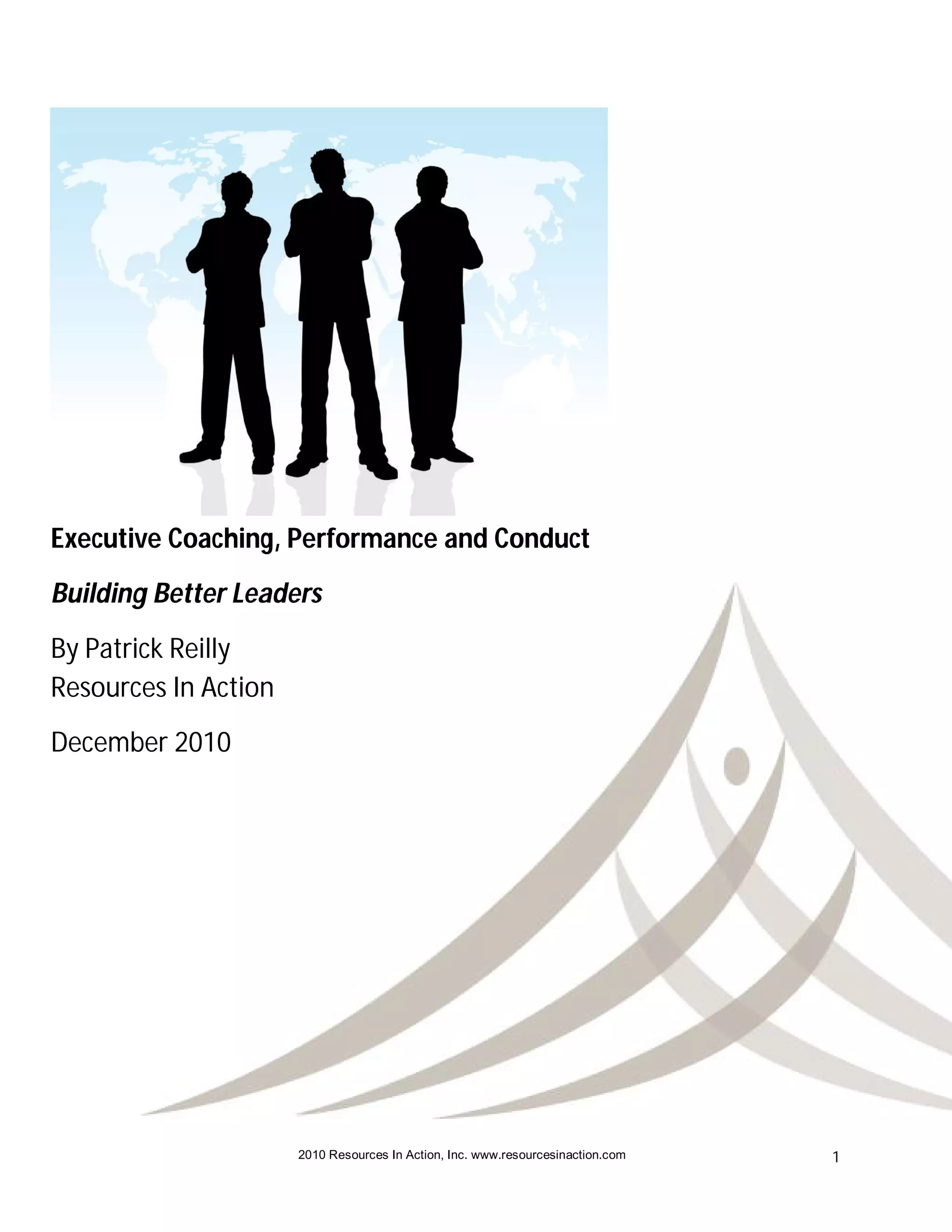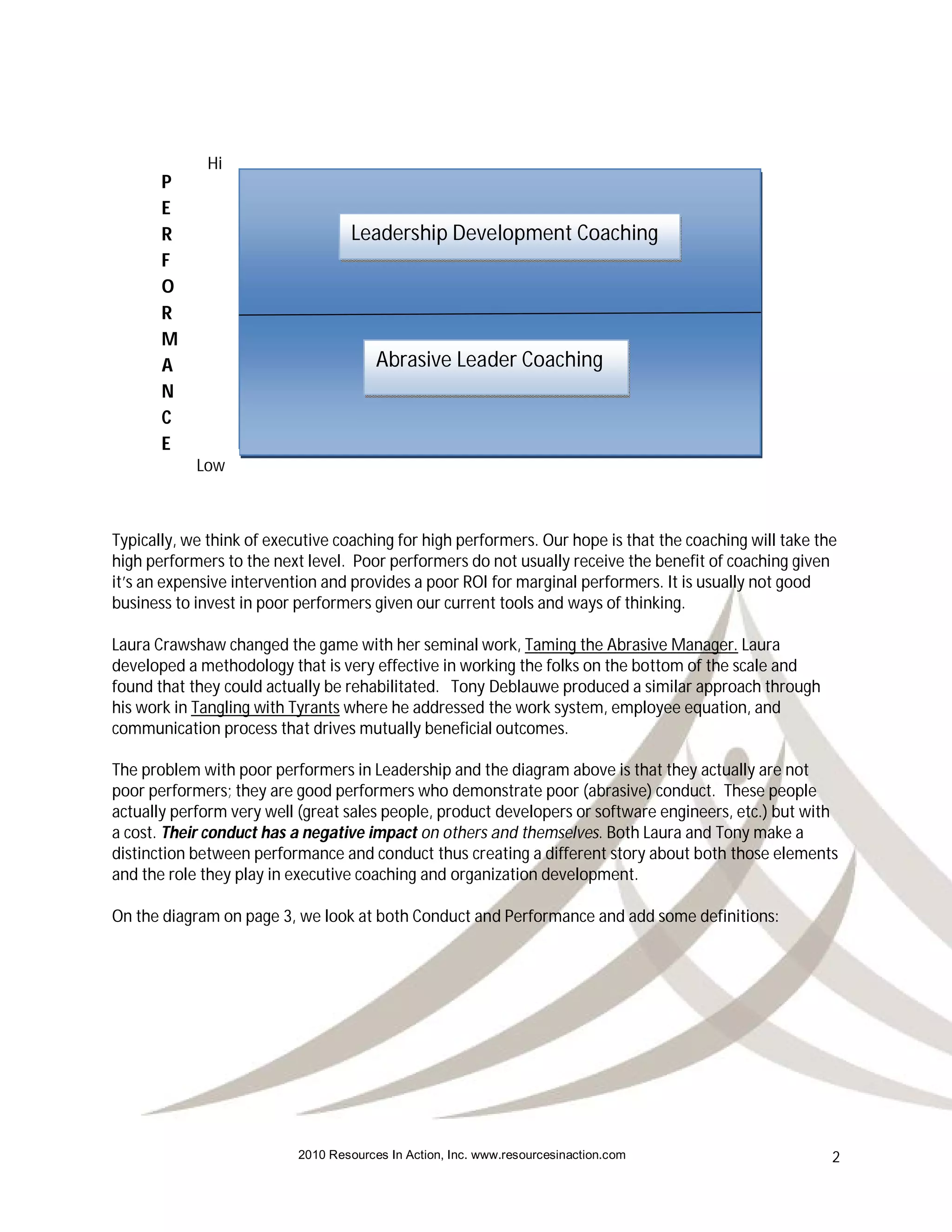 The document discusses the distinction between performance and conduct in executive coaching, emphasizing that abrasive leaders often produce good performance but their conduct negatively impacts others. It highlights insights from Laura Crawshaw and Tony Deblauwe on rehabilitating abrasive leaders while promoting the need for a quality work environment. The authors advocate for a reevaluation of coaching strategies that address conduct among leaders to enhance organizational performance and well-being.