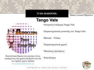 Στις σχολές χορού Apollon μπορείτε να παρακολουθήσετε μαθήματα χορού Tango Vals και να διδαχθείτε όλα τα βήματα του Τανγκό.
