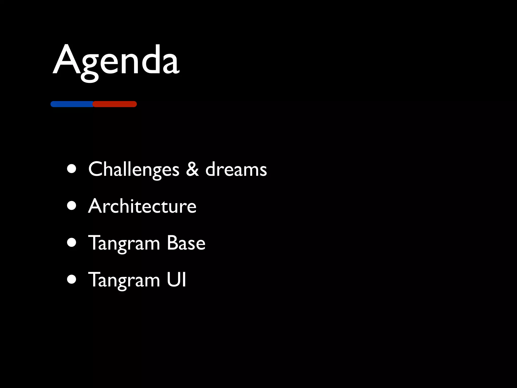 This document discusses Tangram, an open source JavaScript UI library. It covers Tangram's architecture, challenges, dreams and key components. Tangram uses a modular component-based architecture with clear separation of concerns. The base provides DOM manipulation and event handling while components implement specific UI widgets. The UI is constructed from DOM elements, data and controls defined in JavaScript.