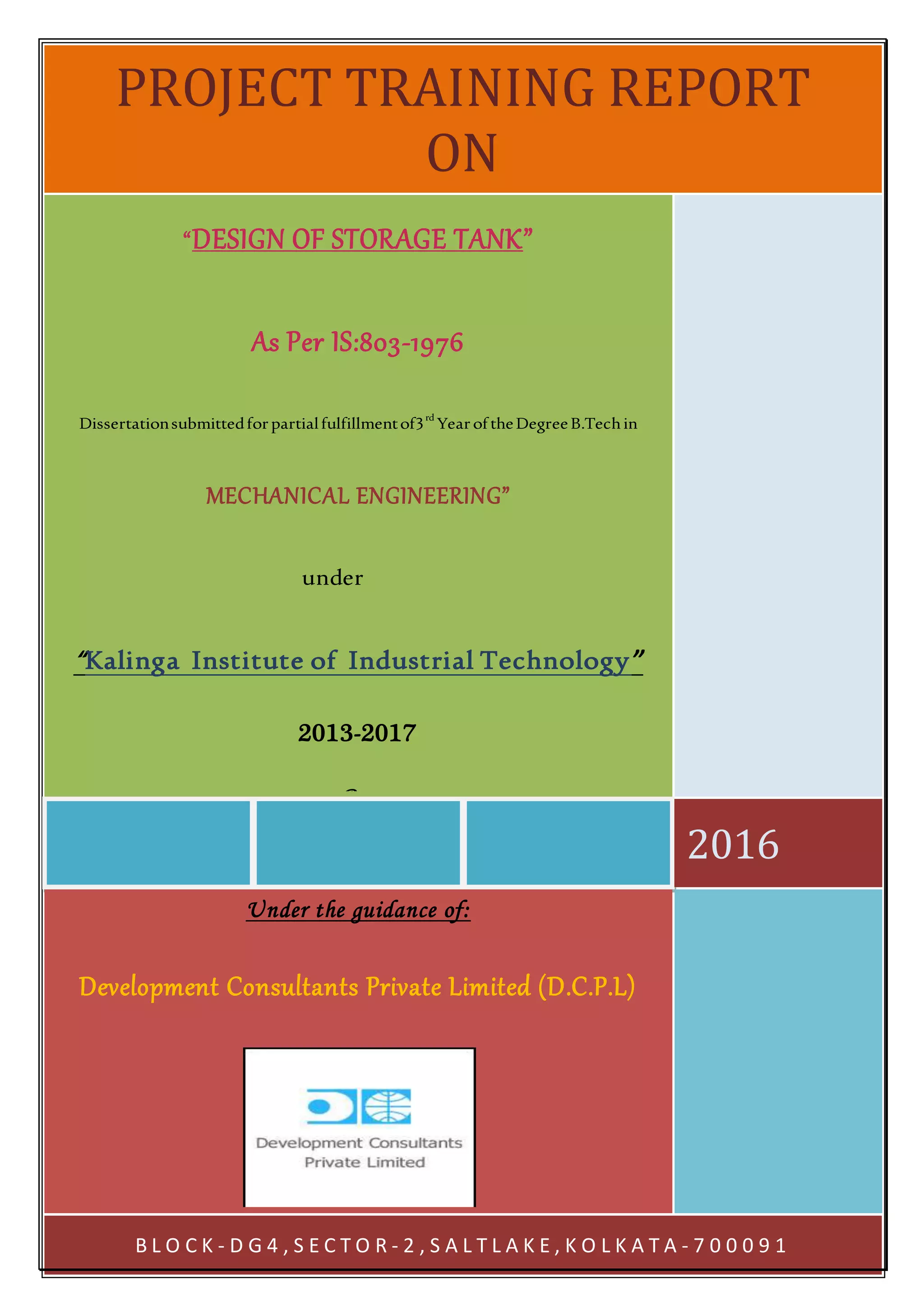 The document summarizes the design of a 200 cubic meter storage tank with a cone roof according to Indian Standard IS 803-1976. Key details include an input table with tank dimensions and material properties, as well as sections summarizing the design basis and code requirements. The design basis section outlines allowable stresses, joint efficiencies, equations for calculating minimum shell plate thickness, and requirements for stability against wind and vacuum loads. The tank has a diameter of 6 meters, height of 7.5 meters, and will store crude oil at temperatures up to 50°C.