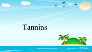 Tannins are complex organic, non-nitrogenous substances that occur as mixtures of polyphenols. They are widely distributed in plants and form colloidal solutions with water. Tannins have various properties including being non-crystallizable, soluble in water and various organic solvents, and causing precipitation of solutions of proteins and metals. They are classified as hydrolysable tannins, condensed tannins, or pseudotannins. Pharmacologically, tannins are used as astringents for the gastrointestinal tract, skin, and eyes. Industrially, they are used in tanning leather, manufacturing inks, and detecting proteins. Common sources of tannins include nut galls, black