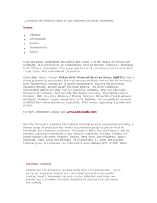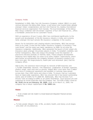 Birla Sun Life Insurance Company Limited (BSLI) is a joint venture between the Aditya Birla Group and Sun Life Financial Inc. established in 2000. BSLI ranks among the top 5 private life insurance companies in India with an extensive network of over 600 branches and 175,000 advisors. Known for its innovations, BSLI was the first to introduce concepts like the free look period and unit linked insurance plans in India.