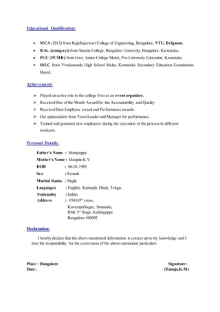 Tanuja is seeking a position that offers professional growth, where she can utilize her 1+ years of experience as an HROC Executive. She has strong skills in PeopleSoft, Kronos, and Microsoft Office from her work at Technosoft Corporation, where she was responsible for processes like promotions, terminations, and updates. Tanuja has an MCA from RajaRajeswari College of Engineering and a B.Sc. in computer science. She aims to focus on her strengths and knowledge to be a better performer and help her organization grow.