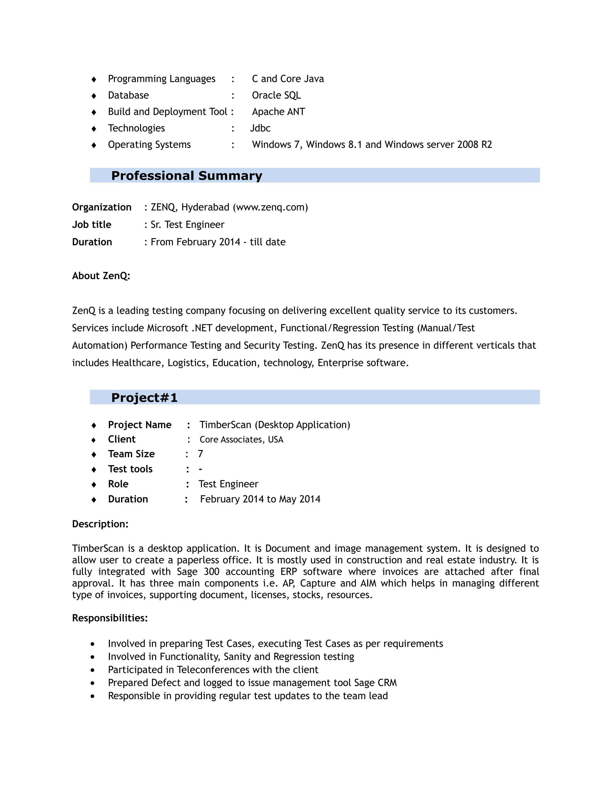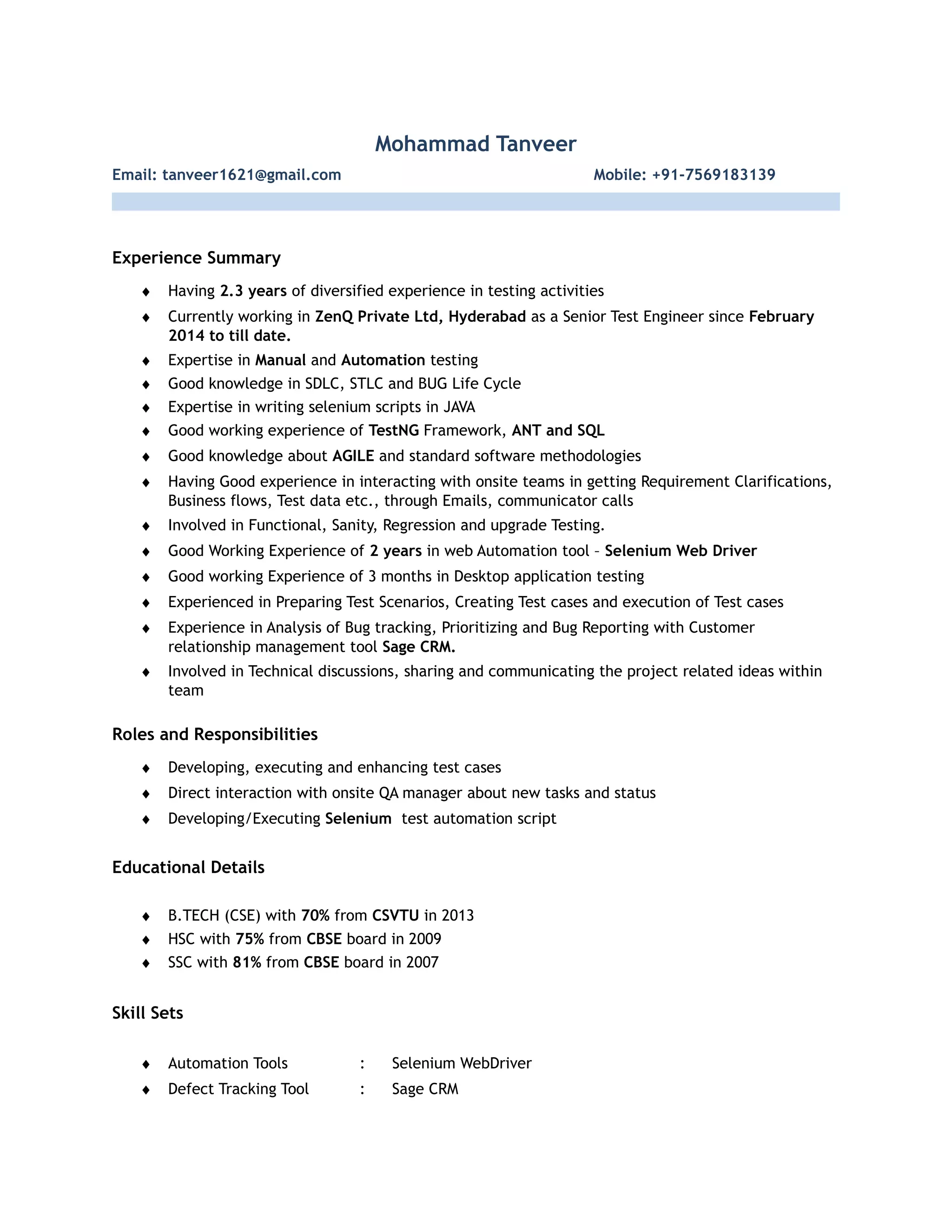 Mohammad Tanveer has over 2 years of experience as a senior test engineer at ZenQ Private Ltd in Hyderabad, India. He has expertise in manual and automation testing using Selenium WebDriver in Java. Some of his responsibilities include developing and executing test cases, interacting with clients, and maintaining test automation scripts. He has worked on projects testing desktop and web applications for clients in the US, focusing on functionality, regression, and upgrade testing. Tanveer holds a B.Tech in computer science and has skills in Selenium, SQL, Java, ANT, and Sage CRM defect tracking.