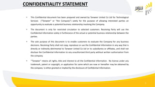 Tanweer United Co Ltd for Technological Services, based in Jeddah, KSA, specializes in RFID technology, IT solutions, and LED lighting, providing comprehensive services from conceptualization to implementation. The document outlines a proposal for an RFID tracking solution aimed at improving inventory management and asset tracking, addressing common challenges in inventory control. Confidentiality measures are emphasized to protect the proprietary information shared with potential partners for evaluation of business relationships.