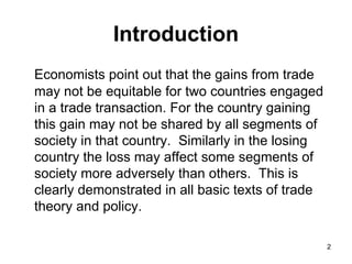 The document discusses the key stakeholders in Tanzania's national trade policy process and their roles and influence. It identifies the main stakeholders as government bodies, farmers/cooperatives, workers unions, industrialists, traders, academics/researchers, NGOs, political parties, and special interest groups. While many groups have a stake in trade policy, the most influential are industrial organizations like manufacturers' associations due to their resources and unified interests. Strengthening stakeholders' participation requires addressing lack of knowledge and resources through training programs. Ongoing public-private dialogue platforms are also important to ensure all voices can be heard in developing trade policy.