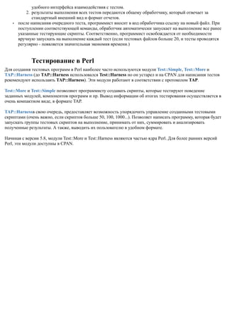 Документ описывает процесс тестирования программного обеспечения, акцентируя внимание на важности тестов для выявления ошибок и снижения затрат на поддержку проекта в будущем. При этом рассматривается модульное тестирование, его методы и использование протокола TAP для унификации результатов тестирования. Также подчеркивается, что написание тестов на ранних этапах разработки способствует повышению качества кода и упрощает его сопровождение.