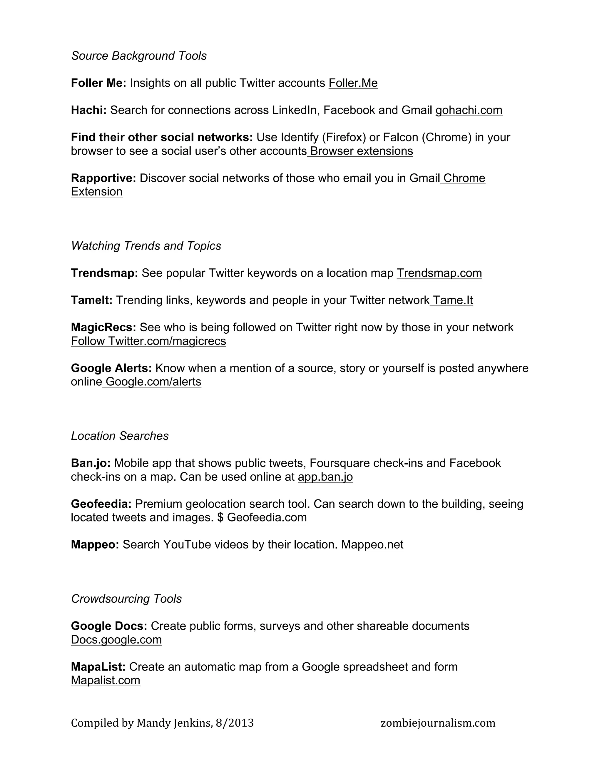 The document provides a comprehensive list of tools for searching and analyzing social media content, including platforms for Twitter, Facebook, and Instagram. It also includes resources for crowdsourcing, curation, and photo verification to assist users in gathering and managing online information. Compiled by Mandy Jenkins in August 2013, it serves as a guide for journalists and content creators in utilizing digital tools for effective research and storytelling.