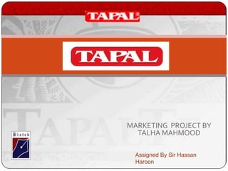 This document provides an overview of Tapal Tea's marketing project. It includes sections on the history of tea, Tapal's introduction, vision/mission statements, product portfolio, brands, SWOT analysis, target marketing, segmentation, positioning, competitors, the marketing mix (4Ps), BCG matrix, recommendations, and conclusions. The key points are that Tapal is Pakistan's largest tea company, with a diverse portfolio of brands, and it faces competition primarily from Unilever Pakistan. The document analyzes Tapal's marketing strategy and makes recommendations around promoting its ice tea product.