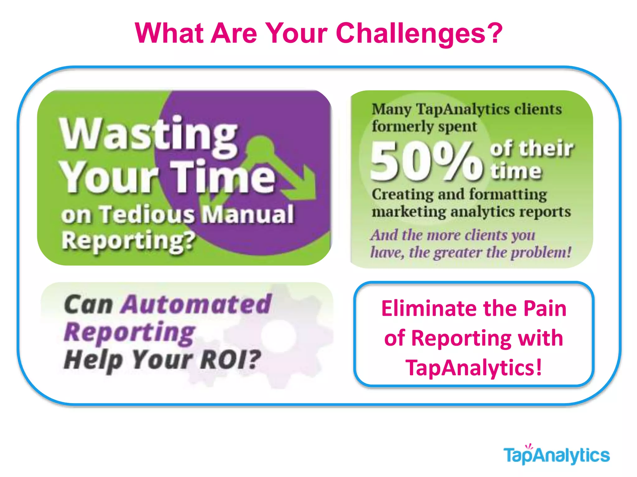 The document describes TapAnalytics, a digital marketing analytics platform that helps agencies save time on reporting, delight clients with customized dashboards and reports, and gain insights to optimize campaigns. It provides unified, configurable dashboards and scheduled email reports. Integrations with various marketing channels allow automated aggregation of campaign data for analysis.