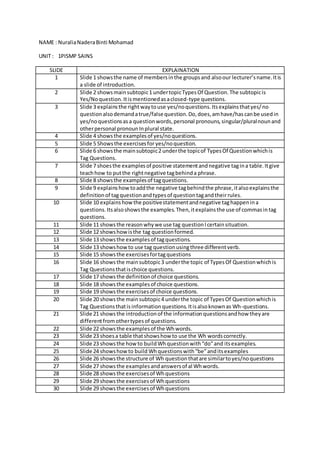 The document summarizes the content of 30 slides explaining different types of questions in English. It outlines the main topics covered which are yes/no questions, tag questions, choice questions, and information questions (wh-questions). For each type of question, the slides provide definitions, examples, rules for formation, and exercises. The document acts as an index for the slide presentation, briefly noting the content and progression of topics covered in each slide.