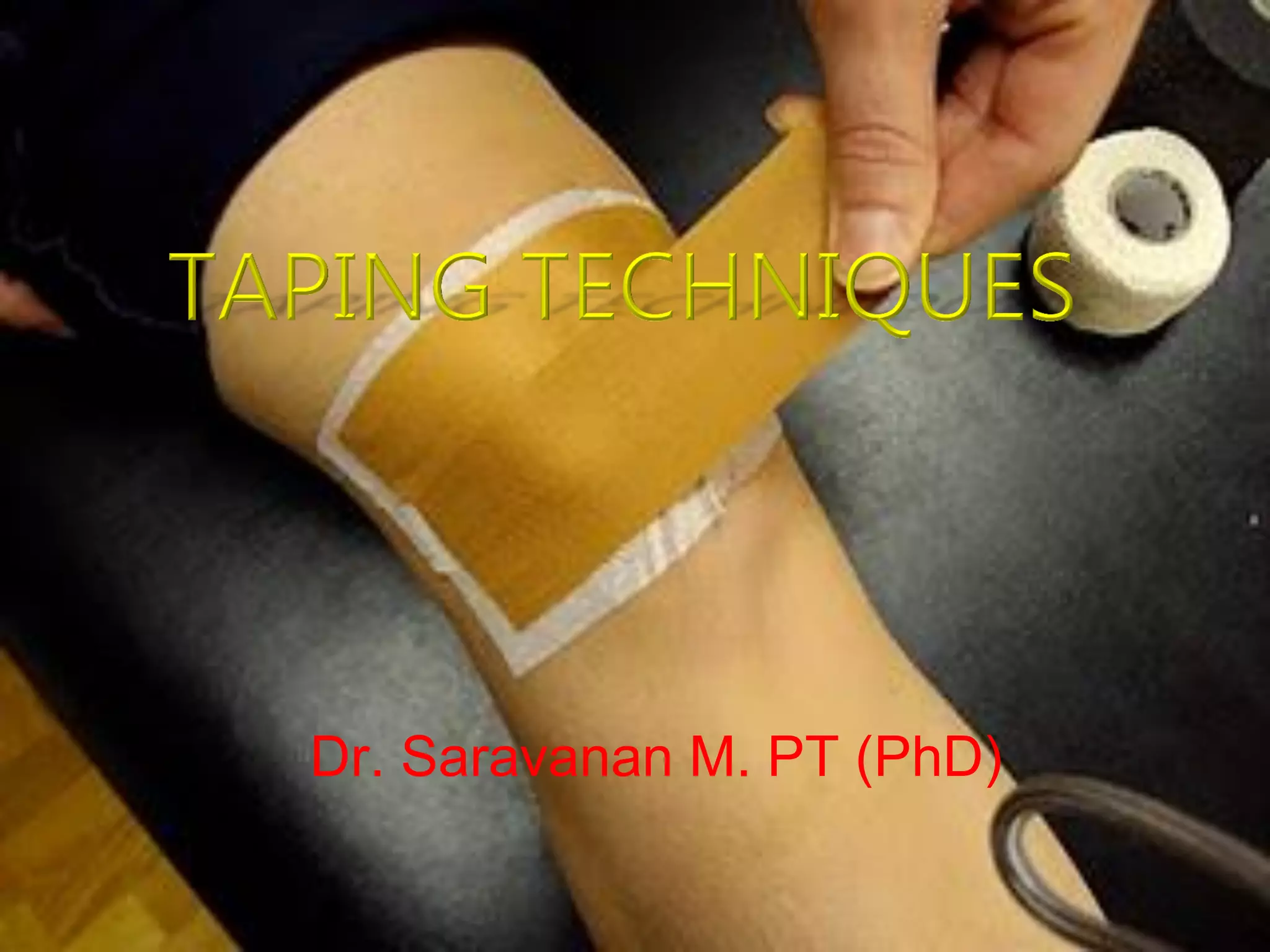 1) Taping is used for a variety of purposes including support, protection, pain relief, edema control, and injury prevention. It works through biomechanical and neurophysiological mechanisms.