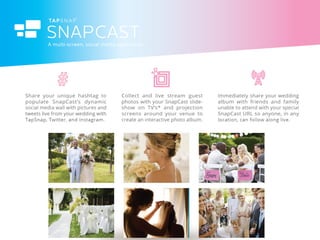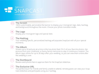 TapSnap is an interactive photo booth company that allows customers to customize their experience. Their partner program offers marketing support and discounts of 15-20% off the standard rates. Partners can book TapSnap for events like weddings and parties, and set their own prices up to the maximum rate. The top revenue generating partner between November 2014 to June 2015 wins two airline tickets.