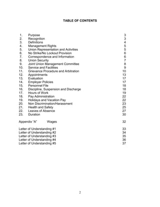 This document is a collective agreement between the University of Ontario Institute of Technology and the Public Service Alliance of Canada union representing teaching assistants and research assistants at the university. The agreement outlines terms of employment such as management rights, union representation, grievance procedures, hours of work, wages, and leaves of absence. It aims to establish orderly collective bargaining and ensure the prompt resolution of disputes between the employer and employees.