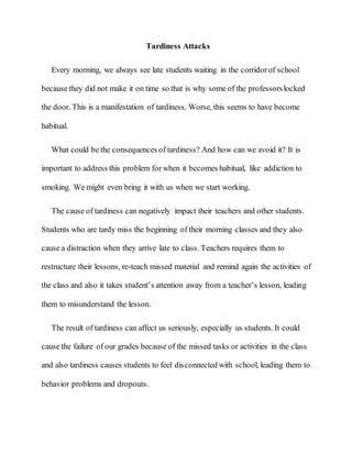 Tardiness negatively impacts both students and teachers. Students who arrive late to class miss important lessons and instructions, which can lead them to misunderstand material and potentially fail classes. Their tardiness also distracts teachers and other students from the lesson. If left unaddressed, habitual tardiness can continue into the workplace and negatively impact one's life and career. To avoid tardiness, students need to practice proper time management, commit to attending class on time each day, and ensure they get enough sleep or wake up early enough to arrive at school when classes begin. Tardiness is a problem that everyone should be concerned with addressing.