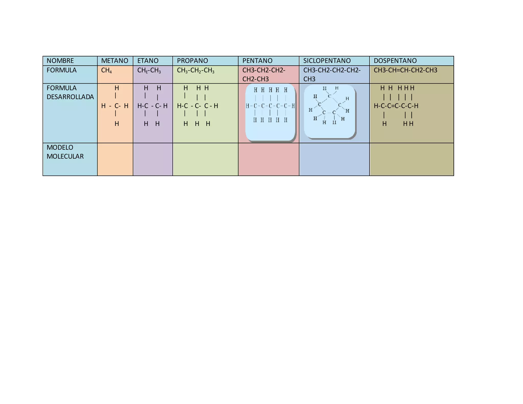 Tarea 1. NOMBRE METANO ETANO PROPANO PENTANO SICLOPENTANO DOSPENTANO