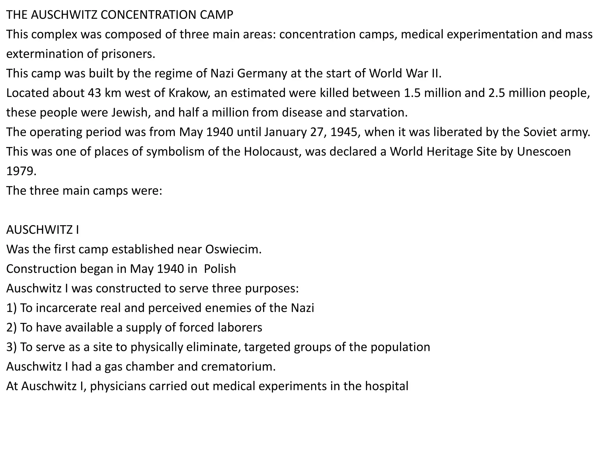 The Auschwitz concentration camp complex consisted of three main camps - Auschwitz I, Auschwitz II Birkenau, and Auschwitz III Monowitz. Between 1940 and 1945, the Nazis deported over 1.3 million people to Auschwitz, where around 1.1 million prisoners were murdered through mass gassing, starvation, disease, or other means. Located near Krakow in Poland, Auschwitz became the largest camp operated by Nazi Germany and was the site of the largest mass murder in history.
