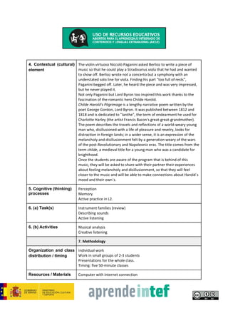 This CLIL didactic unit designed by Roberto San Juan García focuses on Berlioz's Harold in Italy. The unit aims to help students differentiate between instrument families, understand how instruments produce sound, develop active listening skills, and understand programmatic music. Students will review string, woodwind, brass, and percussion instruments. They will also learn about programmatic music and active listening. The unit incorporates vocabulary learning and activities like musical analysis and creative listening. It is organized over five 50-minute classes involving individual work, small groups, and presentations.