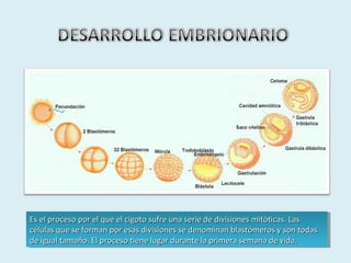 ppoorr eell qquuee eell cciiggoottoo ssuuffrree uunnaa sseerriiee ddee ddiivviissiioonneess mmiittóóttiiccaass.. LLaass ccéélluullaass qquuee ssee ffoorrmmaann ppoorr eessaass ddiivviissiioonneess ssee ddeennoommiinnaann bbllaassttóómmeerrooss yy ssoonn ttooddaass ddee iigguuaall ttaammaaññoo.. EEll pprroocceessoo ttiieennee lluuggaarr dduurraannttee llaa pprriimmeerraa sseemmaannaa ddee vviiddaa.. Es el proceso por el que el cigoto sufre una serie de divisiones mmiittóóttiiccaass.. LLaass ccéélluullaass qquuee ssee ffoorrmmaann ppoorr eessaass ddiivviissiioonneess ssee ddeennoommiinnaann bbllaassttóómmeerrooss yy ssoonn ttooddaass ddee iigguuaall ttaammaaññoo.. EEll pprroocceessoo ttiieennee lluuggaarr dduurraannttee llaa pprriimmeerraa sseemmaannaa ddee vviiddaa..