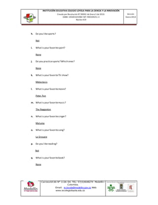 This document introduces an activity from Institución Educativa Colegio Loyola Para La Ciencia Y La Innovación in Medellín, Colombia. The activity asks students to answer questions to introduce themselves, find a partner, ask each other the questions, then introduce their partner to the class. Some of the questions cover name, age, interests, hobbies, favorite subjects and teachers. The document provides an example introduction of a partner.