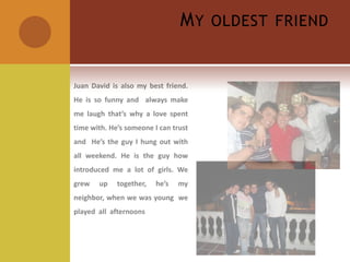 Juan David is Luis's oldest and best friend who introduced him to many girls and activities when they were young. Kevin is Luis's foreign friend from Denmark who Luis met through Juan David at work and sometimes has lunch with. Diana is Luis's school friend who is beautiful with green eyes and brown hair, loves dancing, and is easy to talk to for long periods. They met at a disco and go to the park with her dog Domino.