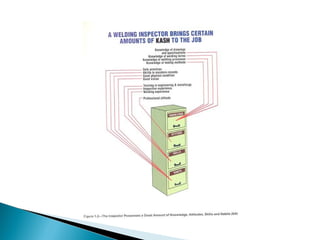 The document discusses the role and responsibilities of a welding inspector. It describes how welding inspectors can be classified based on who they inspect for, such as a code inspector, customer inspector, or manufacturer's inspector. Their main functions are to oversee welding operations and act as specialists by judging whether welds meet specifications. The document then lists the key qualifications needed, including physical abilities, vision, knowledge of welding terminology and processes, drawing and test interpretation skills, and experience maintaining inspection records. It emphasizes the importance of the welding inspector establishing clear communication lines with various parties like welders, supervisors, and engineers.