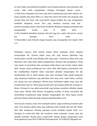 Dokumen tersebut membahas tentang salik dan suluk. Salik adalah orang yang menjalani latihan kerohanian secara bersuluk, sedangkan suluk adalah sistem latihan kerohanian untuk mendekatkan diri kepada Tuhan. Bersuluk melibatkan pengasingan diri dari orang ramai untuk melatih kerohanian dan meninggalkan sifat-sifat buruk. Latihan kerohanian dalam suluk dapat membawa kepada pengalaman spiritual se