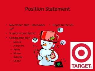 This document provides a position statement and marketing plan for Target stores in a specific district. It summarizes the history of Target starting in 1902, its product offerings aimed at women ages 25-50, and its goals of keeping prices low while giving back. The marketing strategies discussed include using the Target symbol and brand partnerships in positive marketing. It identifies competitive threats from Walmart and sets objectives to increase sales, customer knowledge of Red Card benefits, and Red Card applications around Thanksgiving. A proposed theme of "Walking in a Target Wonderland" is suggested to attract customers and employees during the holiday season.