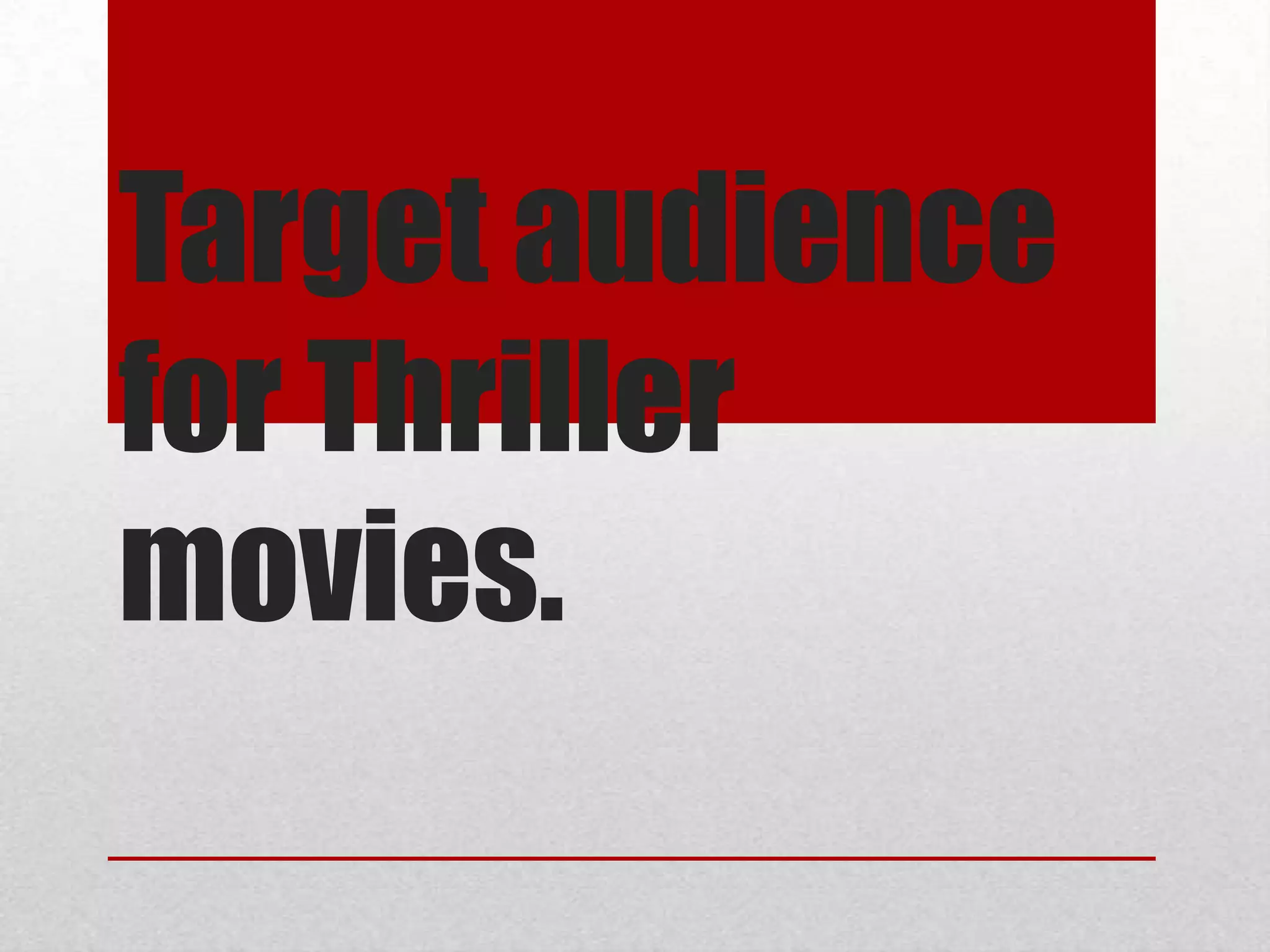 This document discusses the target audience for thriller movies. It states that the main demographic is teenagers aged 15 and older as well as adults, as they can understand the language and scenes in thrillers. It also notes that thrillers grab audience attention through suspenseful music and jumpy scenes that keep viewers on the edge of their seats, making the films feel realistic. Additionally, it suggests 15 is the minimum age as viewers can then focus their minds on the film and comprehend the scenarios.
