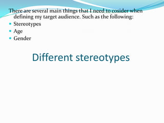 The document discusses several factors to consider when defining a target audience, including stereotypes, age, and gender. It notes that stereotypes like "emo" and "chav" influence music preferences. Younger audiences prefer upbeat music and artists they can relate to, while teenagers like attractive musicians. Middle-aged people listen to music from their youth or current hits. The target audience is defined as ages 15-40, primarily female, students or career-focused with an active lifestyle, interested in music, sports and travel, from a middle-class background. An example profile named Tom and Bronte fits this target audience.