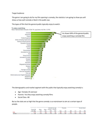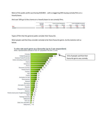 The document provides statistics showing that comedy is a very popular film genre for the general public. Some key points: