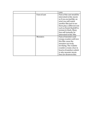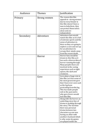 This document analyzes the different audience themes and justifications for a cave exploration and horror film. The primary audience would be strong, independent women due to the lack of male characters in the film. Secondary audiences would include adventure fans drawn to the extreme sports scenes and horror fans intrigued by fears of tight spaces, darkness, and creatures. Gore fans would appreciate the graphic injury depictions, while drama fans would be engaged by the underlying personal drama between characters. Fans of the cast members and monsters/creepy creatures would also find interest in the film.