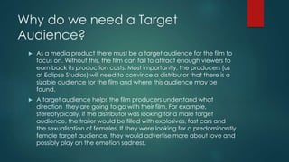 This document discusses target audiences for films. It explains that identifying a target audience helps film producers understand what direction to take the film in order to attract viewers and earn back production costs. Gender and age are discussed as important factors for target audiences. Statistics show males generally prefer action and comedy films while females prefer a broader range of genres. Younger children are targeted through animated films and toys while those aged 15-34 prefer comedies and action films. Older audiences aged 35+ enjoy musicals, dramas, and romantic comedies. The document also notes thrillers should keep audiences guessing without becoming too complicated.
