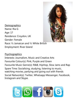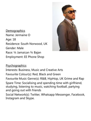 This document contains demographic and psychographic profiles for two individuals, Ria G and Jermaine O, along with an analysis of them as potential audience members. Ria is a 17-year-old female who lives in Croydon and works at River Island. She enjoys journalism, music, and creative arts. Jermaine is an 18-year-old male who lives in South Norwood and works at an EE phone shop. He enjoys business, music, and creative arts. The document explains that these profiles represent the targeted audience of a mixed gender school in London for a music production, and that creating profiles of both male and female audiences is important for understanding their interests.