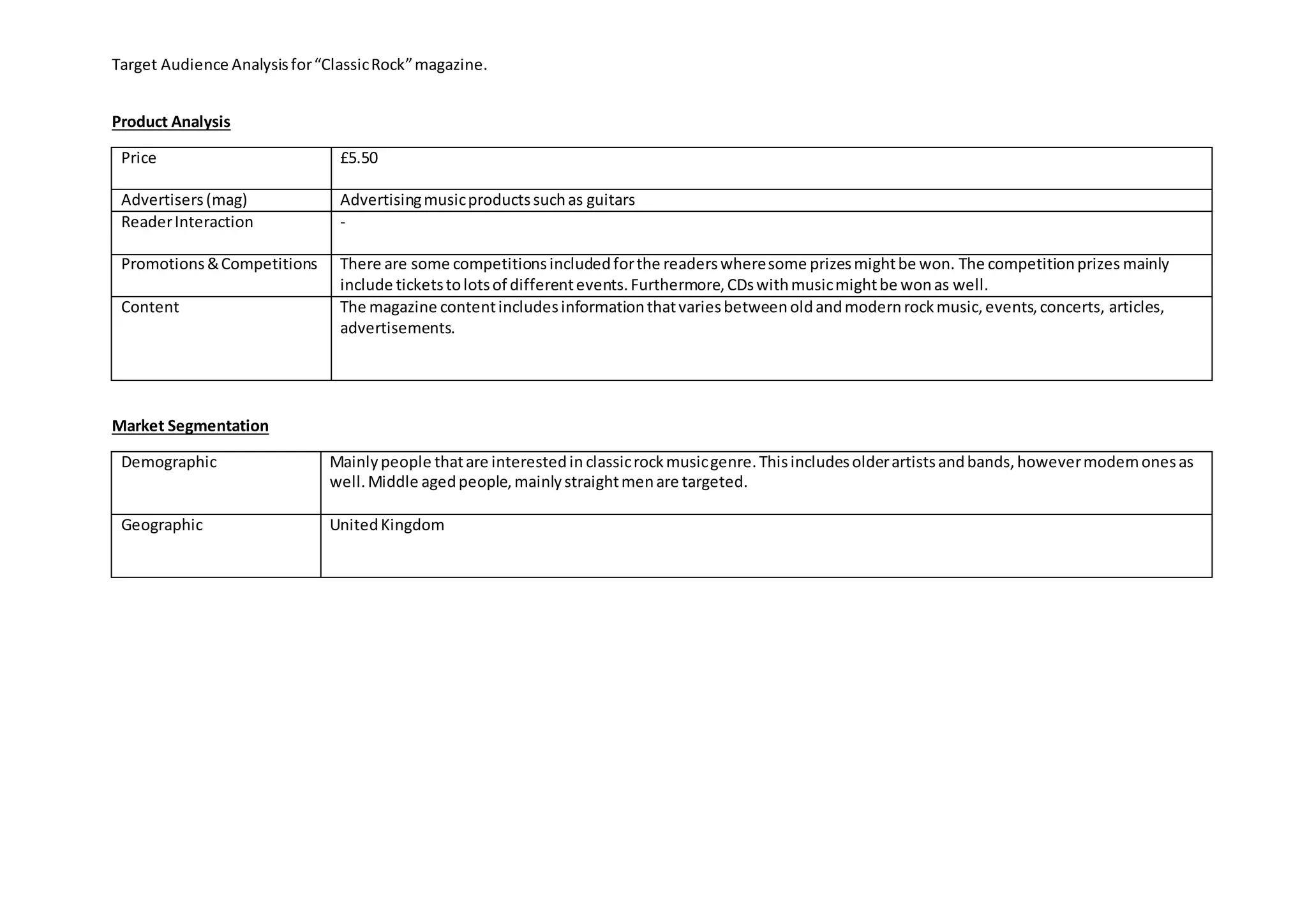 Classic Rock magazine targets middle-aged, straight men in the UK who enjoy classic rock music, both old and modern artists. The £5.50 magazine includes articles about rock music and events, advertisements for music products, and competitions where readers can win tickets to concerts and CDs.
