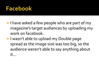 The author asked members of their magazine's target audience to review work by uploading it to Facebook. However, the author was unable to upload a double page spread due to its large image size, so the audience was not able to provide feedback on it. The author is looking for ways to get target audiences to review magazine layouts.