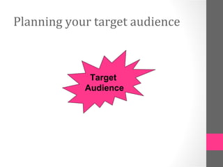 The document provides guidance on creating a target audience profile for advertising a product. It explains that a target audience profile should include an imaginary person's name, age, sex, location, financial status, job, education, interests and hobbies to represent the intended customers. An image should also be chosen from Google to depict the typical target audience. The profile aims to understand what the audience desires in themselves and their lives to effectively plan advertising to that group.