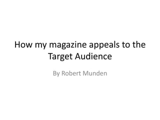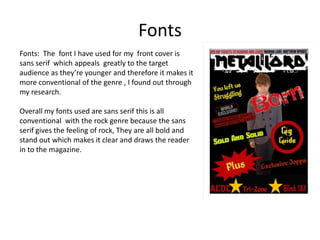 The document discusses how the magazine appeals to its target audience through its use of fonts, content, and mode of address. Sans serif fonts are used throughout to appeal to the younger target audience and convey a rock genre feel. The content on the cover, contents page, and double page spread uses conventional elements like images, pull quotes, and featured bands to attract readers. The mode of address is aggressive on the cover and contents page through serious images and bold design choices, appealing to the target audience.