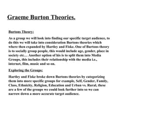 The document discusses various theories for identifying and targeting an audience, including Burton's theory of social and media grouping, Hartley and Fiske's expansion on social grouping, and Maslow's hierarchy of needs. It also outlines Richard Dyer's utopian solutions theory and Blumler and Katz's uses and gratifications theory. The goal is to understand these theories to identify a specific target audience and ensure motives and designs effectively reach them.