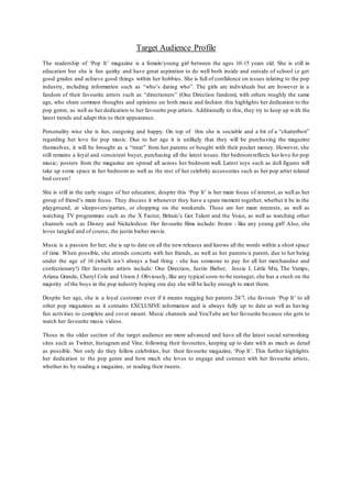 The target audience of 'Pop It' magazine is girls aged 10-15 who are passionate about pop music and culture. She keeps up with the latest trends, artists, and pop news. Music is her main interest and she follows her favorite artists on social media. While still in school, she enjoys discussing pop music with friends and attends concerts whenever possible. The magazine contains exclusive content and activities that appeal to her dedication to the pop genre.