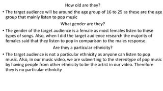 The target audience for the pop music artist is female students aged 16-25 who listen to pop and R&B music. They would likely feel connected to the similar-aged artist and find meaning in the heartbreak-themed lyrics based on their own experiences. The music would be streamed on YouTube and Spotify as most listeners in that age group use streaming services rather than purchasing music.