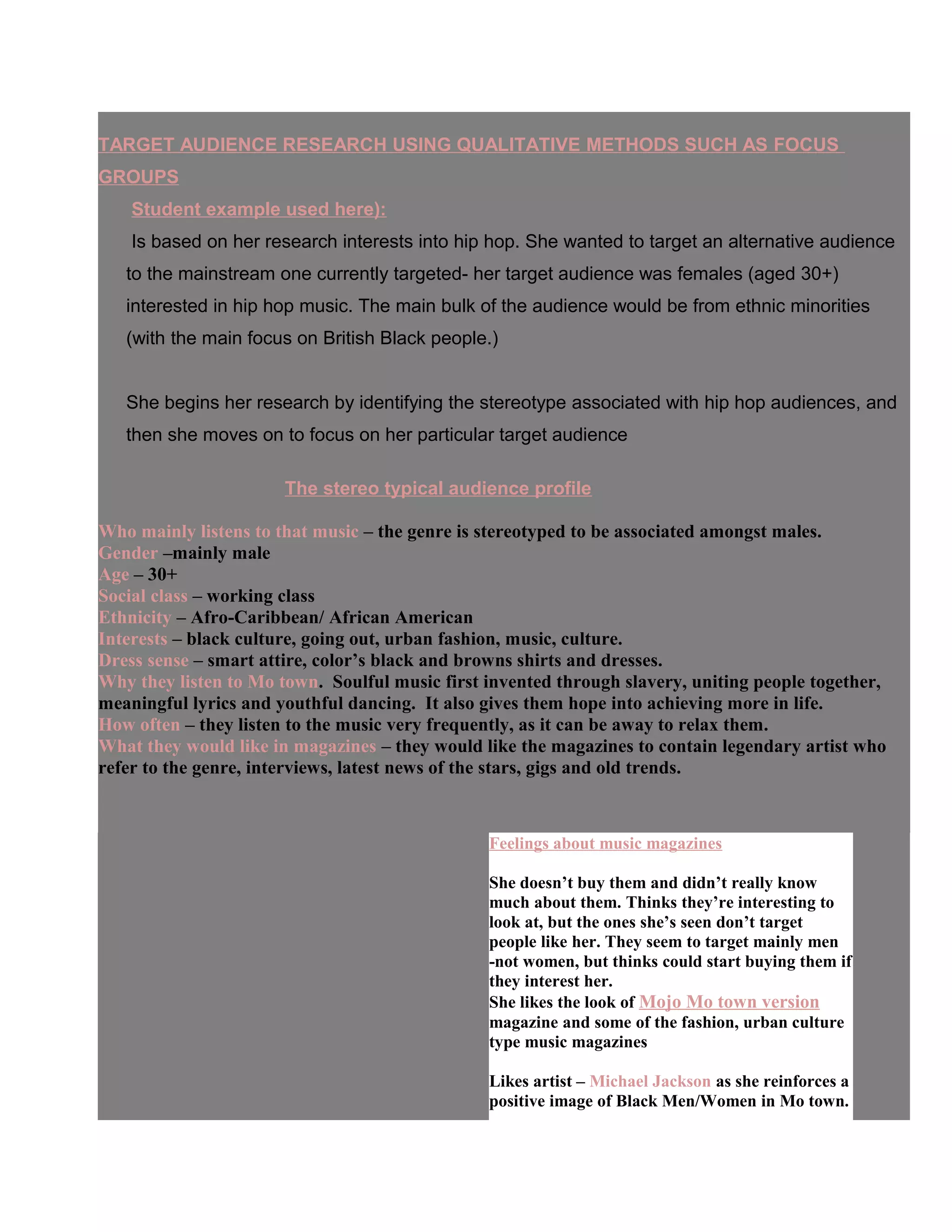The document summarizes research conducted using qualitative focus groups to better understand the target audience for a hip hop music magazine. The researcher was specifically interested in targeting females aged 30+ who enjoy hip hop music, particularly those from ethnic minority backgrounds. Through focus groups, the researcher identified stereotypes about typical hip hop audiences as mainly young males and explored how the target audience differed in their interests, preferences, and relationship to hip hop music magazines.
