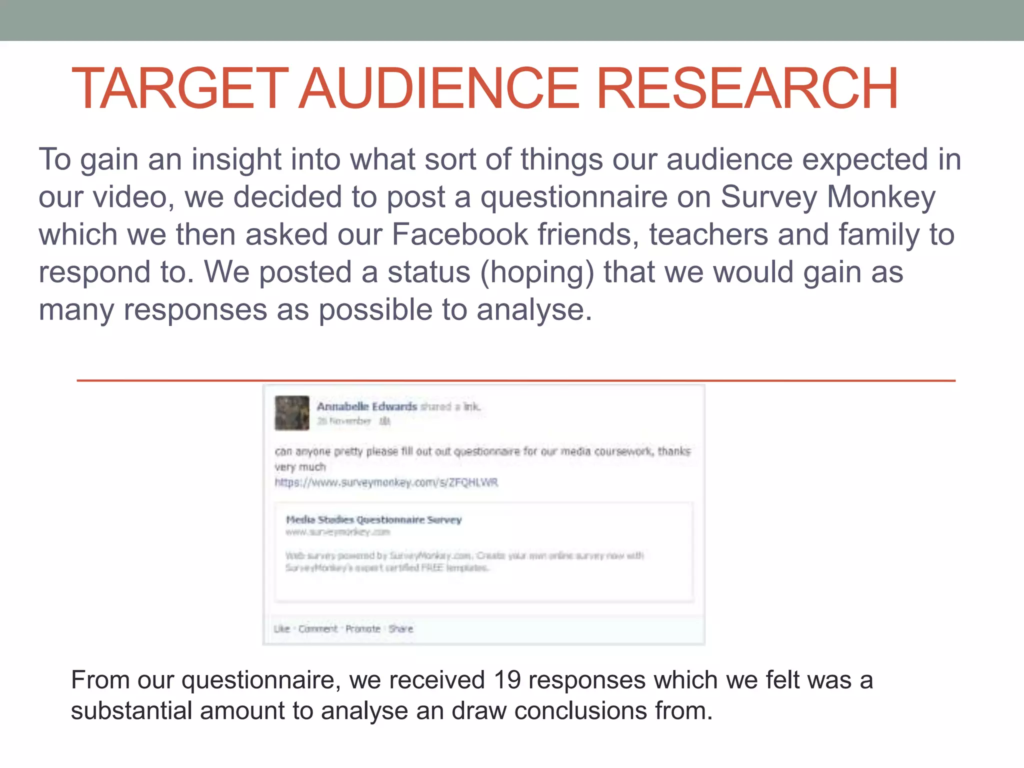 The document summarizes the results of a survey conducted to understand the target audience's expectations for a music video. 19 responses were received from friends, family and teachers. Most respondents were female aged 16-20, who saw music as important. Respondents wanted an individual style with colorful narrative themes set in nature. While image is important, the music itself and instruments were most important to showcase. An interesting narrative was deemed the main attraction of music videos.