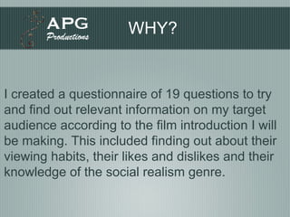 The document summarizes the results of a questionnaire given to the target audience for a new social realism film. Most respondents were male, aged 16, and watched films at least once a week, primarily in the evenings. They had seen short, low-budget films and enjoyed films addressing social issues like drugs and money problems. This information will help the filmmaker ensure the film appeals to the target audience.