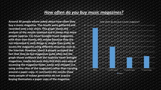 The document analyzes the results of a survey about music magazine preferences. It finds that most people prefer red or white coloring for magazines and are willing to pay £1-4, with £3 being a good price point. The front cover is highly influential in getting people to buy a magazine. Music and celebrity gossip magazines are the most interesting types. Most people attend music concerts 1-3 times a year and never buy physical magazines, instead accessing them online.