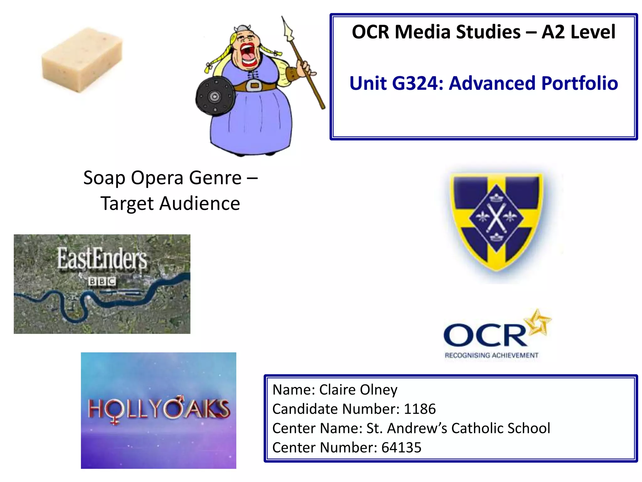 The document analyzes the target audiences of two British soap operas - EastEnders and Hollyoaks. It discusses that EastEnders typically appeals to an older working class audience who can relate to the characters' situations. In contrast, Hollyoaks targets a younger audience still in education through storylines focused on issues relevant to teenagers like pregnancy and sexuality. Both soaps aim to portray real life problems and provide helpline information to help audience members dealing with similar issues.