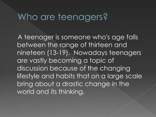 Teenagers ages 13-19 are increasingly a topic of discussion due to changes in lifestyle and habits that impact society. The document focuses on youths ages 13-17, finding that most teenagers, both boys and girls, prefer pop music. Teenage girls may work in the service industry and live independently from their families, while their hobbies have shifted from collecting dolls to watching TV, listening to music, and some not participating in extracurricular activities due to busy modern lives. Boys tend to be independent, work on their own to build their futures, spend most of their time with friends, and enjoy sports, technology like mobile phones and computers, and video games.