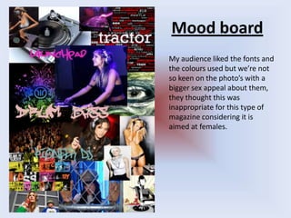The target audience provided feedback on the mood board for a magazine aimed at females. They felt some of the photos with stronger sexual appeal were inappropriate. They appreciated a photo of an artist looking away from the camera as it showed a rebellious side. The audience also liked the simplicity of the media product with easy to read text about stories over an image of an artist, keeping the focus on the music. They were impressed with the downmarket mood created by editing photos with dark shades and shadowing.