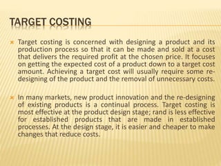Target costing is a technique used to design products and processes to achieve a target cost that allows the product to be sold at a predetermined price and achieve the desired profit margin. It focuses on reducing costs during the design stage when changes are easier to make. Implementing target costing involves determining specifications, price, profit, and calculating the target cost. The gap between estimated and target costs is then closed through redesigning the product or process. Value analysis examines which features customers value and which costs can be reduced without affecting customer perceived quality.